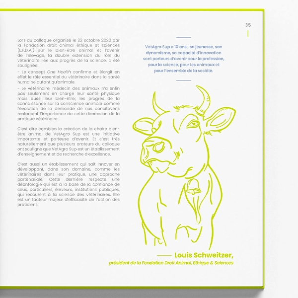 Ce livret célèbre 10 ans d'actions collectives au service la santé globale, et propose des perspectives d'avenir face aux enjeux du monde de demain. En vue de cet événement, Vetagro Sup m'a sollicité pour illustrer l'ensemble des actions menées en mettant en valeur la nature et le vivant.